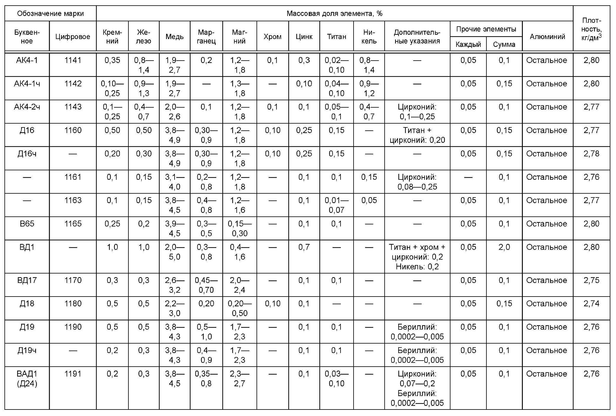 Согласно требованиям ГОСТ 4784-2019, химический состав сплава АК4-1 включает следующие элементы: