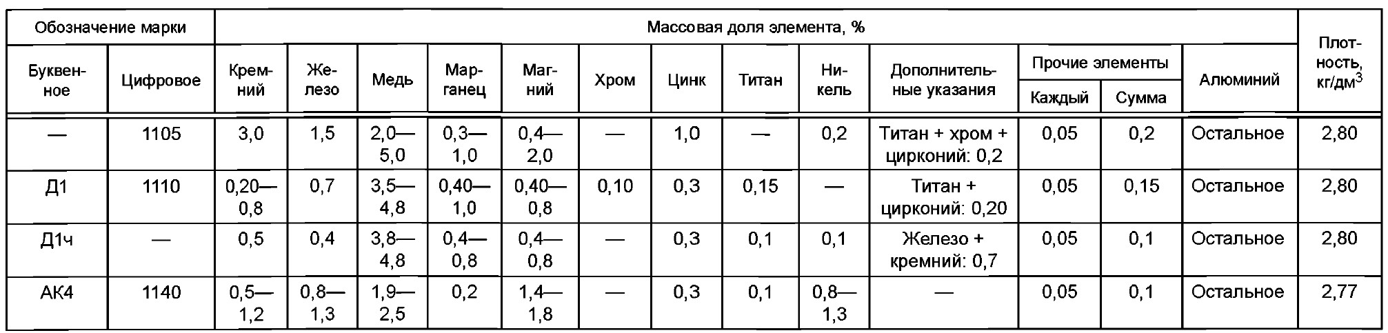 Согласно требованиям ГОСТ 4784-2019, химический состав сплава Д1 включает следующие элементы: