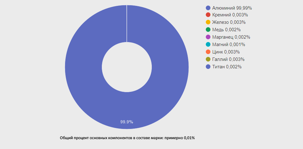 Особенностью алюминия А99 является беспрецедентно низкое содержание примесей, что обеспечивается применением сложных многостадийных технологий рафинирования, включая зонную плавку, вакуумную дистилляцию и электрохимическую очистку. Такая чистота позволяет достичь максимально возможных показателей электропроводности, пластичности и коррозионной стойкости.