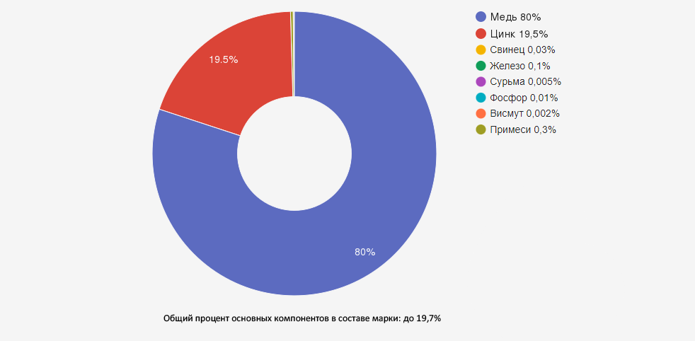 | Медь (Cu) | 79,0-81,0 | Определяет основные характеристики сплава: пластичность, коррозионную стойкость, теплопроводность и электропроводность |