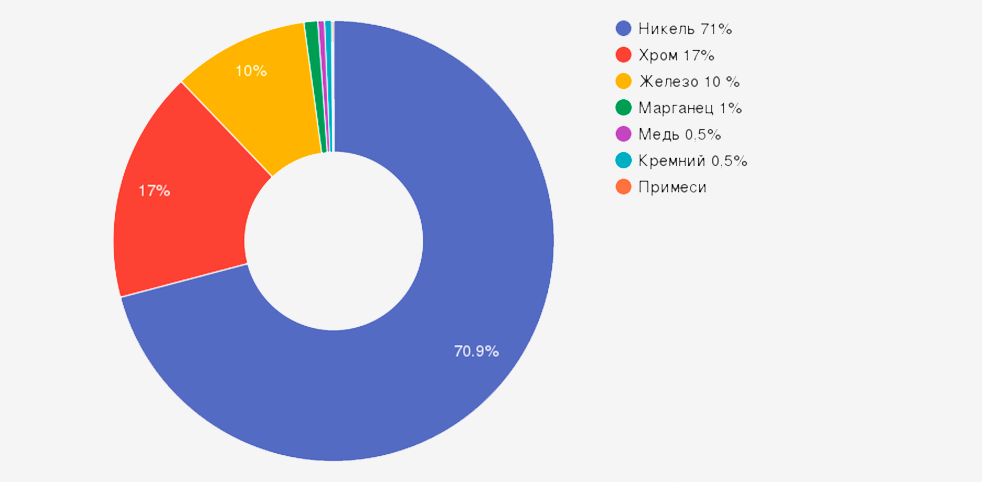 Высокое содержание никеля в составе Inconel 600 (72%) отличает его от других сплавов семейства Inconel и обеспечивает ключевые эксплуатационные характеристики: