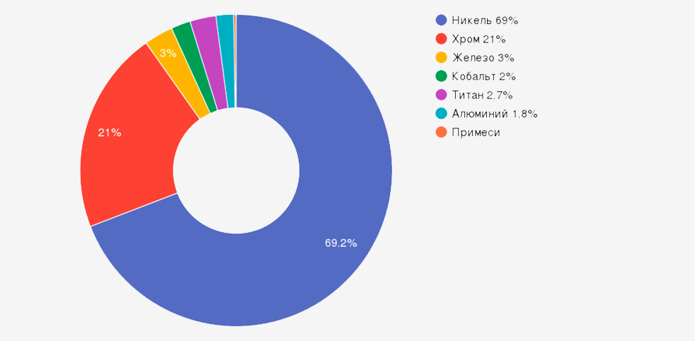 Никель (Ni) основа (74-77) Основа матрицы, обеспечивает стабильную аустенитную структуру